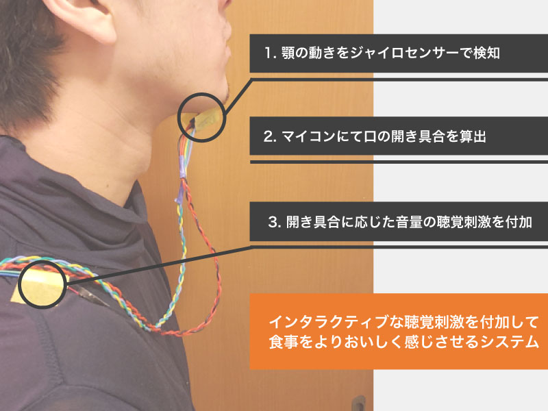 厚生労働省は、健康寿命と食の間には密接な関係があるとしている。食には身体的、精神的健康に及ぼす影響が大きい。しかし、高齢者が利用する介護食は、顎や舌といった口腔周囲筋を使う機会を減少させ、口腔周囲筋の衰えの助長、聴覚や触覚的なインタラクションの低減などのデメリットが存在する。本研究では,食のおいしさに聴覚刺激が与える影響に着目し、介護食にインタラクティブな聴覚刺激を付加する。そして、口腔周囲筋を使う機会を増やし、高齢者が食事をおいしく摂取して口腔周囲筋をはじめとした身体機能低下の予防と食体験を向上させるデバイスを開発し、その有用性を検証する。