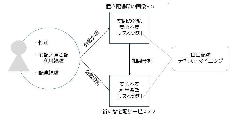 置き配などの新たな宅配サービスが拡大したことで,新たな不安の声も挙がっている.令和 2 年 3 月に国土交通省,経済産業省によっておこなわれた第 5回置き配検討会では,盗難等のトラブルや外装表示によるプライバシー課題など ,リスクとプライバシーの両方の面で不安があるとまとめられている .また,大きな課題としてリスク・セキュリティ対策,たくさんの人が利用することになった際の置き配実施の留意点,指定可能な場所の範囲が挙げられている.しかし, リスク認知には様々な要因による個人差があると考えられる また, 空間とリスクの認知によって宅配サービスの受容にも変化が生じると予想されるさらに,新たな宅配サービスを充実させるためには,既存のサービスで どのように空間とリスクを判断しているのかも検討する必要がある.